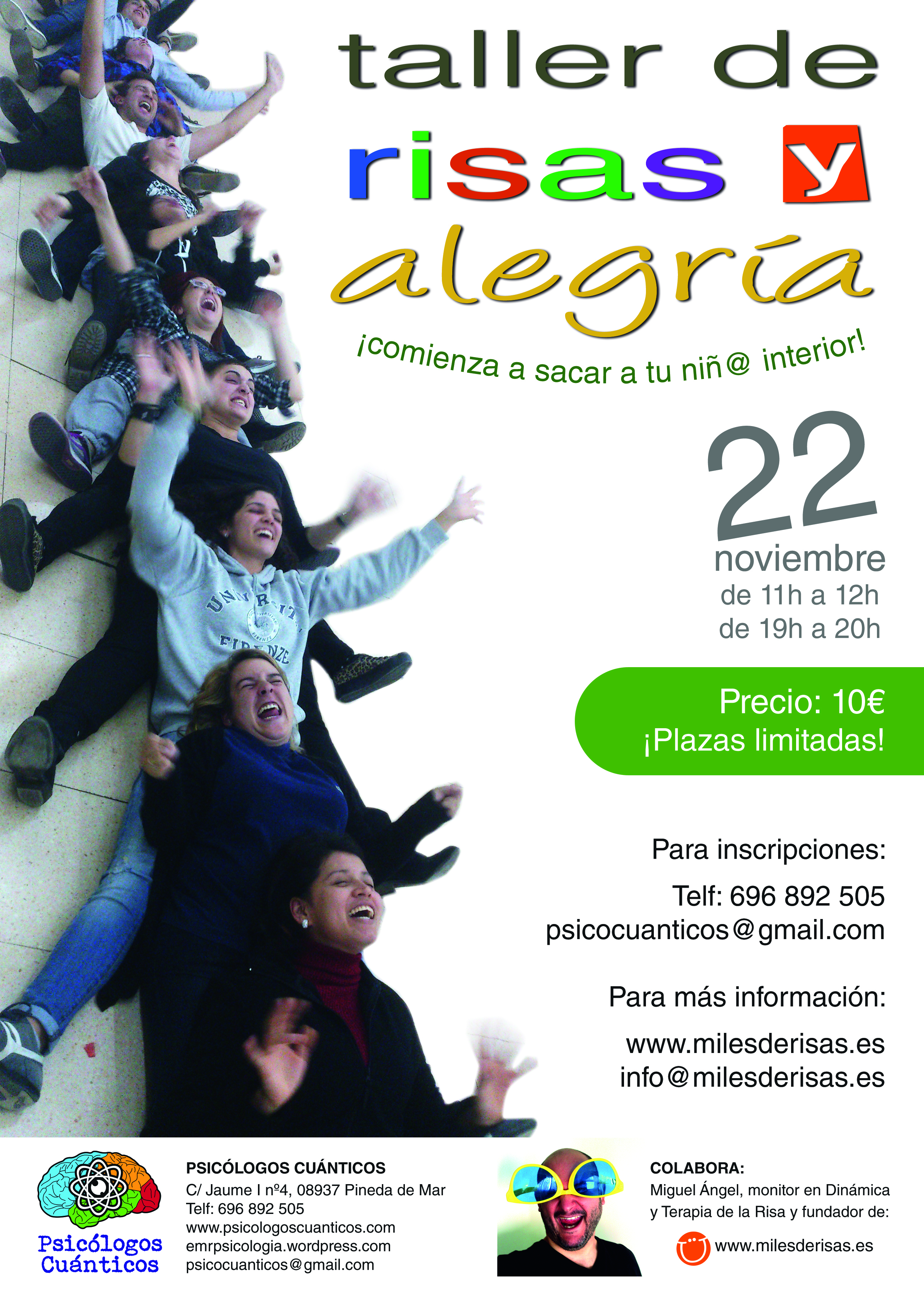Me complace presentaros el próximo taller que vamos a realizar en el Psicólogos Cuánticos (Pineda de Mar): «TALLER DE RISAS Y ALEGRIA». Destinado a cualquier persona a la que le apetezca conectar con su niñ@ interior, desconectar de la rutina y los problemas cotidianos y pasar un buen rato.